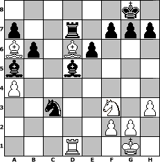 game notation in PGN-format [Event "Die Wikinger XVIII - Finale"] [Site "www.myChess.de"] [Date "2022.11.04"] [Round "1"] [White "Seneca"] [Black "Oste152V4"] [ECO "A45"] [WhitemyELO "1518"] [BlackmyELO "1766"] [Result "0-1"] [TimeControl "10/2592000"] [WhiteDays "30"] [BlackDays "13"] [MyChessNo "127872"] 1. d4 Nf6 2. e3 e6 3. Nd2 b6 4. Ngf3 Bb7 5. Bd3 c5 6. c3 Be7 7. O-O O-O 8. e4 d6 9. e5 dxe5 10. Nxe5 cxd4 11. cxd4 Qxd4 12. Ndf3 Qd5 13. Qe2 Nc6 14. Bc4 Nd4 15. Qd3 Nxf3+ 16. Nxf3 Qxd3 17. Bxd3 Rfd8 18. Be2 Rac8 19. Be3 Rc2 20. Rfe1 Rxb2 21. h3 Bb4 22. Reb1 Rxb1+ 23. Rxb1 Ba5 24. Bg5 Bd5 25. Rd1 Rc8 26. a4 Ne4 27. Be7 Nc3 28. Ba6 Rc7 29. Bd6 Rd7 0-1 position notation in FEN-format 6k1/p2r1ppp/Bp1Bp3/b2b4/P7/2n2N1P/5PP1/3R2K1 - - - 7 30 Captured white pieces: Captured black pieces: Click on a captured piece in order to display the desired move!