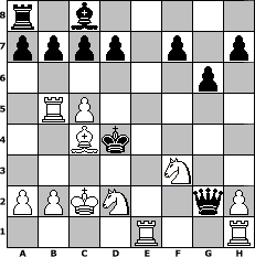 game notation in PGN-format [Event "f"] [Site "www.myChess.de"] [Date "2005.12.25"] [Round "1"] [White "Antaeus"] [Black "crca108"] [ECO "A20"] [WhitemyELO "1493"] [BlackmyELO "1426"] [Result "1-0"] [TimeControl "10/864000"] [WhiteDays "10"] [BlackDays "10"] [MyChessNo "21119"] 1. c4 e5 2. e4 g6 3. d4 exd4 4. Qxd4 Nf6 5. Bg5 Bg7 6. e5 Nc6 7. exf6 Nxd4 8. fxg7 Nc2+ 9. Kd1 Qxg5 10. gxh8=Q+ Ke7 11. Kxc2 Qf5+ 12. Bd3 Qxf2+ 13. Nd2 Qxg2 14. Re1+ Kd6 15. Qe5+ Kc6 16. Qb5+ Kd6 17. c5+ Kd5 18. Bc4+ Kd4 19. Ngf3+ 1-0 position notation in FEN-format r1b5/pppp1p1p/6p1/1RP5/2Bk4/5N2/PPKN2qP/4R2R - - - 4 19 Captured white pieces: Captured black pieces: Click on a captured piece in order to display the desired move!