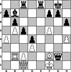 game notation in PGN-format [Event "Prätorianer"] [Site "www.myChess.de"] [Date "2023.01.04"] [Round "1"] [White "Haneken"] [Black "Master1"] [ECO "C44"] [WhitemyELO "1173"] [BlackmyELO "1340"] [Result "0-1"] [TimeControl "10/1728000"] [WhiteDays "20"] [BlackDays "20"] [MyChessNo "128899"] 1. e4 e5 2. Nf3 Nc6 3. d3 Nf6 4. Be2 d5 5. O-O d4 6. Bd2 Bc5 7. h3 O-O 8. b4 Bd6 9. b5 Ne7 10. Qc1 c5 11. Na3 b6 12. Nc4 h6 13. Rb1 Bc7 14. Ncxe5 Bxe5 15. Nxe5 Re8 16. a4 Nd7 17. Nxd7 Qxd7 18. Bf4 Ng6 19. Bg3 Qe7 20. Bf3 Bb7 21. h4 Ne5 22. Bh5 Rac8 23. f4 Nd7 24. f5 Nf6 25. e5 Nxh5 26. Bf2 Qxe5 27. g4 Ng3 28. Re1 Ne2+ 29. Rxe2 Qxe2 30. Rb2 Qxg4+ 31. Kf1 Qg2# 0-1 position notation in FEN-format 2r1r1k1/pb3pp1/1p5p/1Pp2P2/P2p3P/3P4/1RP2Bq1/2Q2K2 - - - 2 32 Captured white pieces: Captured black pieces: Click on a captured piece in order to display the desired move!