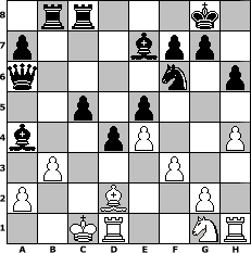 game notation in PGN-format [Event "7. Frankenwaldturnier"] [Site "www.myChess.de"] [Date "2008.07.18"] [Round "1"] [White "scherry"] [Black "Naunhofer"] [ECO "A00"] [WhitemyELO "1432"] [BlackmyELO "1616"] [Result "0-1"] [TimeControl "10/864000"] [WhiteDays "24"] [BlackDays "29"] [MyChessNo "46414"] 1. e3 d5 2. c4 c6 3. c5 e5 4. d4 Nd7 5. Bd2 Ngf6 6. Nc3 Be7 7. Be2 O-O 8. Qc2 h6 9. O-O-O b6 10. f3 bxc5 11. dxc5 Nxc5 12. h4 Qb6 13. e4 d4 14. Na4 Nxa4 15. Qxa4 Rb8 16. b3 Bd7 17. Bc4 Rfc8 18. Ba6 c5 19. Ba5 Qxa6 20. Bd2 Bxa4 0-1 position notation in FEN-format 1rr3k1/p3bpp1/q4n1p/2p1p3/b2pP2P/1P3P2/P2B2P1/2KR2NR - - - 0 21 Captured white pieces: Captured black pieces: Click on a captured piece in order to display the desired move!
