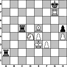 game notation in PGN-format [Event "Sommerevent"] [Site "www.myChess.de"] [Date "2018.07.12"] [Round "1"] [White "Steffi"] [Black "miu"] [ECO "C46"] [WhitemyELO "1570"] [BlackmyELO "1548"] [Result "1-0"] [TimeControl "10/1728000"] [WhiteDays "11"] [BlackDays "20"] [MyChessNo "112619"] 1. e4 e5 2. Nf3 Nc6 3. Nc3 d6 4. d4 Bg4 5. Bb5 a6 6. Bxc6+ bxc6 7. dxe5 Bxf3 8. Qxf3 dxe5 9. O-O Nf6 10. Rd1 Bd6 11. b3 Qe7 12. Bb2 Rd8 13. Qe2 a5 14. Qa6 O-O 15. Qxc6 Ne8 16. Qd5 a4 17. a3 Nf6 18. Qc4 axb3 19. cxb3 Ng4 20. h3 Nf6 21. b4 Qe6 22. Qxe6 fxe6 23. f3 Nh5 24. Ne2 Rb8 25. Rac1 Rfd8 26. g3 Bc5+ 27. Rxc5 Rxd1+ 28. Kf2 Rd2 29. Bxe5 Rbd8 30. Rxc7 Ra2 31. Rc3 Ra8 32. g4 Nf6 33. h4 R8xa3 34. Rc8+ Kf7 35. Rc7+ Kg6 36. Bf4 h5 37. g5 Ne8 38. Re7 Nf6 39. gxf6 gxf6 40. Rxe6 Rb3 41. Be5 Rxb4 42. Rxf6+ Kh7 43. Rd6 Rc4 44. Ke3 Rcc2 45. Rd7+ Kg8 46. Nd4 Rc5 47. Rg7+ 1-0 position notation in FEN-format 6k1/6R1/8/2r1B2p/3NP2P/4KP2/r7/8 - - - 10 47 Captured white pieces: Captured black pieces: Click on a captured piece in order to display the desired move!
