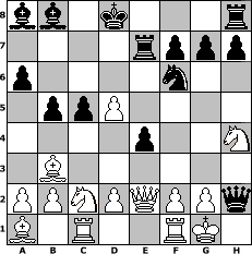 game notation in PGN-format [Event "chess960 f"] [Site "www.myChess.de"] [Date "2007.08.26"] [Round "1"] [White "Ziegert"] [Black "reisinger"] [Variant "Fischerrandom"] [SetUp "1"] [FEN "bbrknqnr/pppppppp/8/8/8/8/PPPPPPPP/BBRKNQNR w KQkq - 0 1"] [WhitemyELO "1546"] [BlackmyELO "1594"] [Result "0-1"] [TimeControl "10/1728000"] [WhiteDays "20"] [BlackDays "39"] [MyChessNo "37588"] 1. Ngf3 c5 2. e4 b6 3. c3 e5 4. Bd3 d5 5. Ba6 Rc7 6. exd5 Rd7 7. c4 Ngf6 8. Qe2 Qd6 9. Bb5 Re7 10. Nc2 Nc7 11. Ba4 a6 12. O-O b5 13. Bb3 e4 14. Nh4 Ncxd5 15. cxd5 Qxh2# 0-1 position notation in FEN-format bb1k3r/4rppp/p4n2/1ppP4/4p2N/1B6/PPNPQPPq/B1R2RK1 - k - 0 16 Captured white pieces: Captured black pieces: Click on a captured piece in order to display the desired move!