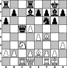 game notation in PGN-format [Event "M"] [Site "www.myChess.de"] [Date "2013.09.19"] [Round "1"] [White "Tomino"] [Black "kalle"] [ECO "A46"] [WhitemyELO "1706"] [BlackmyELO "1603"] [Result "0-1"] [TimeControl "10/3456000"] [WhiteDays "00"] [BlackDays "36"] [MyChessNo "90322"] 1. d4 Nf6 2. Nf3 d5 3. Bf4 g6 4. h3 Bg7 5. e3 O-O 6. c4 c5 7. Nc3 cxd4 8. Nxd4 Nbd7 9. cxd5 Qa5 10. Nb3 Qb6 11. Be2 Nc5 12. Nxc5 Qxc5 13. Rc1 Bd7 14. O-O Rfd8 15. e4 a6 0-1 position notation in FEN-format r2r2k1/1p1bppbp/p4np1/2qP4/4PB2/2N4P/PP1PBPP1/2RQ1RK1 - - - 0 16 Captured white pieces: Captured black pieces: Click on a captured piece in order to display the desired move!