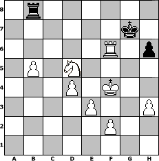 game notation in PGN-format [Event "Zwischendurch mal ein paar eigene Z"] [Site "www.myChess.de"] [Date "2007.11.12"] [Round "1"] [White "nogumo"] [Black "Helmut48"] [ECO "A00"] [WhitemyELO "1696"] [BlackmyELO "1388"] [Result "1-0"] [TimeControl "10/1728000"] [WhiteDays "74"] [BlackDays "80"] [MyChessNo "39759"] 1. b4 Nf6 2. Bb2 e6 3. b5 b6 4. e3 a6 5. a4 axb5 6. axb5 Rxa1 7. Bxa1 c6 8. c4 cxb5 9. cxb5 Qc7 10. Bxf6 gxf6 11. Nf3 Bc5 12. g3 Bb7 13. Bg2 Bb4 14. O-O Bd5 15. Qc1 Qxc1 16. Rxc1 O-O 17. Nd4 Bxg2 18. Kxg2 Bc5 19. Nb3 d5 20. Nxc5 bxc5 21. Rxc5 Nd7 22. Rc6 Rb8 23. Nc3 f5 24. d4 Rb6 25. Kf3 Kf8 26. Kf4 h6 27. h3 Rb8 28. g4 Kg7 29. gxf5 Kf6 30. Nxd5+ Kg7 31. fxe6 fxe6 32. Rxe6 Nf6 33. Rxf6 1-0 position notation in FEN-format 1r6/6k1/5R1p/1P1N4/3P1K2/4P2P/5P2/8 - - - 0 33 Captured white pieces: Captured black pieces: Click on a captured piece in order to display the desired move!