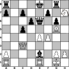 game notation in PGN-format [Event "3. Norderstedter DENK MAL Open 2012"] [Site "www.myChess.de"] [Date "2012.02.08"] [Round "1"] [White "BobbyF4"] [Black "Knight"] [ECO "C21"] [WhitemyELO "1531"] [BlackmyELO "1260"] [Result "1-0"] [TimeControl "10/2592000"] [WhiteDays "26"] [BlackDays "30"] [MyChessNo "79785"] 1. e4 e5 2. d4 exd4 3. c3 dxc3 4. Bc4 cxb2 5. Bxb2 Nc6 6. f4 d6 7. Nf3 Bg4 8. O-O Nf6 9. Nc3 g6 10. Nd5 Nxd5 11. Bxd5 Bg7 12. Bxg7 Rg8 13. Bxc6+ bxc6 14. Qd4 c5 15. Qc3 Qd7 16. Bf6 Qe6 17. Ng5 Qd7 18. Nxh7 Qe6 19. Bg5 Be2 20. Nf6+ Kf8 21. Nh7+ Ke8 22. Rfe1 1-0 position notation in FEN-format r3k1r1/p1p2p1N/3pq1p1/2p3B1/4PP2/2Q5/P3b1PP/R3R1K1 - - - 8 22 Captured white pieces: ![]() ![]() ![]() ![]() ![]() ![]() ![]() ![]() ![]() ![]() ![]() ![]() ![]() ![]() ![]() Captured black pieces: ![]() ![]() ![]() ![]() ![]() ![]() ![]() ![]() ![]() ![]() ![]() ![]() ![]() ![]() ![]() Click on a captured piece in order to display the desired move!
