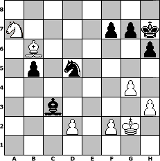 game notation in PGN-format [Event "Das Jahr 2008"] [Site "www.myChess.de"] [Date "2007.12.23"] [Round "1"] [White "Phantasos"] [Black "Grubengeist"] [ECO "D11"] [WhitemyELO "2100"] [BlackmyELO "1913"] [Result "1/2-1/2"] [TimeControl "10/2592000"] [WhiteDays "108"] [BlackDays "120"] [MyChessNo "40877"] 1. d4 d5 2. c4 c6 3. Nf3 dxc4 4. e3 Be6 5. Qc2 Nf6 6. Bxc4 Bxc4 7. Qxc4 Qa5+ 8. Nc3 e6 9. a3 Be7 10. O-O O-O 11. e4 Nbd7 12. Be3 Rfd8 13. Rfd1 Rac8 14. Qe2 h6 15. h3 Qh5 16. Rac1 Nf8 17. b4 N8h7 18. d5 exd5 19. exd5 Nxd5 20. Nxd5 Rxd5 21. Rxd5 Qxd5 22. Bxa7 Bf6 23. Rd1 Qb3 24. Rd7 b5 25. Qe3 Qxe3 26. Bxe3 Nf8 27. Ra7 Ne6 28. g4 Rd8 29. Ra6 Bb2 30. Kg2 Rd1 31. Nh4 Rd3 32. Nf5 Bxa3 33. Ne7+ Kh7 34. Nxc6 Rc3 35. Na7 Nc7 36. Rc6 Bxb4 37. Rxc3 Bxc3 38. Bb6 Nd5 1/2-1/2 position notation in FEN-format 8/N4ppk/1B5p/1p1n4/6P1/2b4P/3P1PK1/8 - - - 2 39 Captured white pieces: ![]() ![]() ![]() ![]() ![]() ![]() ![]() ![]() ![]() ![]() ![]() ![]() ![]() ![]() ![]() Captured black pieces: ![]() ![]() ![]() ![]() ![]() ![]() ![]() ![]() ![]() ![]() ![]() ![]() ![]() ![]() ![]() Click on a captured piece in order to display the desired move!