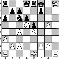 game notation in PGN-format [Event "Aufs neue Jahr!!!"] [Site "www.myChess.de"] [Date "2016.01.06"] [Round "1"] [White "Geisterreiter"] [Black "lotchi"] [ECO "C24"] [WhitemyELO "1334"] [BlackmyELO "1038"] [Result "1-0"] [TimeControl "10/2592000"] [WhiteDays "85"] [BlackDays "90"] [MyChessNo "102031"] 1. e4 e5 2. Bc4 Nf6 3. d3 Nc6 4. Nf3 h6 5. a3 d6 6. h3 Be6 7. Be3 Be7 8. Nc3 O-O 9. Qe2 Bxc4 10. Bxh6 gxh6 11. dxc4 Nh7 12. h4 a6 13. Qe3 Qd7 14. Qxh6 Qd8 15. Ng5 Bxg5 16. hxg5 Re8 17. Qxh7+ Kf8 18. Qh8+ Ke7 19. Nd5+ Kd7 20. Nf6+ Ke6 21. Qh3+ Ke7 22. Nd5+ Kf8 23. Qh8# 1-0 position notation in FEN-format r2qrk1Q/1pp2p2/p1np4/3Np1P1/2P1P3/P7/1PP2PP1/R3K2R - KQ - 12 23 Captured white pieces: Captured black pieces: Click on a captured piece in order to display the desired move!