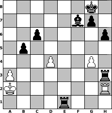 game notation in PGN-format [Event "Pfingsten 2011"] [Site "www.myChess.de"] [Date "2011.06.07"] [Round "1"] [White "alpacino"] [Black "Achimkogge"] [ECO "C26"] [WhitemyELO "1276"] [BlackmyELO "1377"] [Result "0-1"] [TimeControl "10/1728000"] [WhiteDays "73"] [BlackDays "75"] [MyChessNo "74416"] 1. e4 e5 2. Nc3 Nf6 3. Nf3 Bc5 4. Qe2 O-O 5. Nxe5 d6 6. Nd3 Bg4 7. f3 Be6 8. a3 a5 9. Nxc5 dxc5 10. d3 c6 11. Bg5 h6 12. Bxf6 Qxf6 13. e5 Qh4+ 14. g3 Qd4 15. Qe4 Qd7 16. O-O-O Bf5 17. Qe3 Na6 18. g4 Bg6 19. h3 Rae8 20. f4 f6 21. Ne4 fxe5 22. Nxc5 Nxc5 23. Qxc5 exf4 24. Qxa5 Qd4 25. Qd2 Qd5 26. Kb1 Qxh1 27. Bg2 Qh2 28. d4 f3 29. Bxf3 Qxd2 30. Rxd2 Rxf3 31. Rh2 Re1+ 32. Ka2 b5 33. c3 Bf7+ 34. b3 Rxc3 35. Kb2 Rxb3+ 36. Ka2 Rxh3+ 0-1 position notation in FEN-format 6k1/5bp1/2p4p/1p6/3P2P1/P6r/K6R/4r3 - - - 0 37 Captured white pieces: Captured black pieces: Click on a captured piece in order to display the desired move!