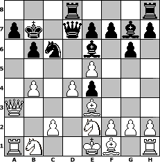 game notation in PGN-format [Event "RDK Open 2007"] [Site "www.myChess.de"] [Date "2007.05.29"] [Round "1"] [White "Meta"] [Black "BirdofPray1"] [ECO "A00"] [WhitemyELO "2197"] [BlackmyELO "2215"] [Result "1/2-1/2"] [TimeControl "10/3456000"] [WhiteDays "40"] [BlackDays "32"] [MyChessNo "35261"] 1. Nc3 d5 2. d4 g6 3. e4 Nf6 4. e5 Ne4 5. Qd3 Nc6 6. Nge2 Bf5 7. Nxe4 dxe4 8. Qc4 Be6 9. Qc3 Qd7 10. Be3 O-O-O 11. b4 Bg7 12. a4 b6 13. a5 Kb7 14. axb6 cxb6 15. Qa3 1/2-1/2 position notation in FEN-format 3r3r/pk1qppbp/1pn1b1p1/4P3/1P1Pp3/Q3B3/2P1NPPP/RN2KB1R - KQ - 1 15 Captured white pieces: Captured black pieces: Click on a captured piece in order to display the desired move!
