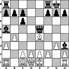 game notation in PGN-format [Event "Wrixum - Open die VIII"] [Site "www.myChess.de"] [Date "2011.01.17"] [Round "1"] [White "Duschgel"] [Black "Lemmi11"] [ECO "A16"] [WhitemyELO "1589"] [BlackmyELO "1766"] [Result "0-1"] [TimeControl "10/2592000"] [WhiteDays "30"] [BlackDays "30"] [MyChessNo "71327"] 1. c4 Nf6 2. Nc3 e5 3. g3 Bb4 4. Bg2 O-O 5. Nf3 Nc6 6. Nd5 e4 7. Ng5 Nxd5 8. cxd5 Qxg5 9. dxc6 dxc6 10. Bxe4 Bh3 11. a3 Ba5 12. b4 Qe5 0-1 position notation in FEN-format r4rk1/ppp2ppp/2p5/b3q3/1P2B3/P5Pb/2PPPP1P/R1BQK2R - KQ - 1 13 Captured white pieces: Captured black pieces: Click on a captured piece in order to display the desired move!