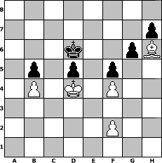 game notation in PGN-format [Event "Kleines Herbstturnier"] [Site "www.myChess.de"] [Date "2004.10.28"] [Round "2"] [White "Robur"] [Black "Seneca"] [ECO "B07"] [WhitemyELO "1634"] [BlackmyELO "1506"] [Result "1-0"] [TimeControl "10/2592000"] [WhiteDays "114"] [BlackDays "149"] [MyChessNo "7651"] 1. e4 d6 2. d4 g6 3. c3 Bg7 4. Nf3 Nf6 5. Bd3 O-O 6. O-O Nbd7 7. Re1 c5 8. Be3 b6 9. dxc5 dxc5 10. e5 Nd5 11. Bc1 e6 12. Be4 Nxe5 13. Nxe5 Bxe5 14. Bxd5 Bxh2+ 15. Kxh2 exd5 16. Kg1 Bb7 17. Bh6 Re8 18. Rxe8+ Qxe8 19. Nd2 Qe5 20. Qg4 f5 21. Qa4 Qe6 22. Kf1 Bc6 23. Qd1 Re8 24. Nf3 Bb5+ 25. Kg1 Be2 26. Qe1 Bxf3 27. Qxe6+ Rxe6 28. gxf3 Re2 29. Rb1 Kf7 30. Kf1 Re6 31. Re1 Rxe1+ 32. Kxe1 a6 33. a4 b5 34. axb5 axb5 35. Ke2 Ke6 36. Ke3 Kf6 37. b4 cxb4 38. cxb4 Ke6 39. Kd4 Kd6 40. f4 1-0 position notation in FEN-format 8/7p/3k2pB/1p1p1p2/1P1K1P2/8/5P2/8 - - - 0 40 Captured white pieces: Captured black pieces: Click on a captured piece in order to display the desired move!