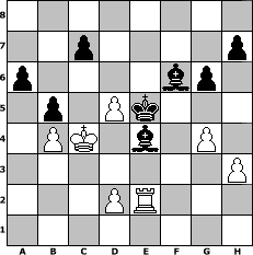 game notation in PGN-format [Event "Turnier gegen Regen :>"] [Site "www.myChess.de"] [Date "2006.09.04"] [Round "1"] [White "Caligula"] [Black "Phantasos"] [ECO "A48"] [WhitemyELO "1829"] [BlackmyELO "2060"] [Result "0-1"] [TimeControl "10/1728000"] [WhiteDays "97"] [BlackDays "86"] [MyChessNo "28148"] 1. d4 Nf6 2. Nf3 g6 3. e3 Bg7 4. c4 O-O 5. Be2 d6 6. Nc3 Nbd7 7. O-O e5 8. dxe5 dxe5 9. e4 Qe7 10. Nd5 Nxd5 11. cxd5 Nc5 12. Qc2 f5 13. exf5 e4 14. Ng5 Rxf5 15. Be3 Rxg5 16. Bxc5 Qe5 17. Be3 Rf5 18. Rae1 Rf7 19. b3 Bf8 20. f4 exf3 21. Bxf3 Bd6 22. g3 Bh3 23. Rf2 Re8 24. Qc4 Qxe3 25. Rxe3 Rxe3 26. Be2 Rxe2 27. Rxf7 Re1+ 28. Kf2 Rf1+ 29. Qxf1 Bxf1 30. Rf3 Bh3 31. Rc3 Kf7 32. Rc4 Bf5 33. Ke3 Bb1 34. Ra4 Kf6 35. Kd4 a6 36. a3 Bc2 37. Kc3 Bd1 38. Re4 Bf3 39. Re6+ Kf5 40. Kd4 Bxa3 41. Re3 Bb2+ 42. Kc4 Be4 43. Re2 Bf6 44. h3 Ke5 45. g4 b6 46. b4 b5+ 0-1 position notation in FEN-format 8/2p4p/p4bp1/1p1Pk3/1PK1b1P1/7P/3PR3/8 - - - 0 47 Captured white pieces: Captured black pieces: Click on a captured piece in order to display the desired move!