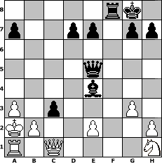 game notation in PGN-format [Event "1. Chess960/6"] [Site "www.myChess.de"] [Date "2007.03.01"] [Round "1"] [White "mcdean@"] [Black "Morus@"] [Variant "Fischerrandom"] [SetUp "1"] [FEN "rbqkbrnn/pppppppp/8/8/8/8/PPPPPPPP/RBQKBRNN w KQkq - 0 1"] [WhitemyELO "1500"] [BlackmyELO "1500"] [Result "0-1"] [TimeControl "10/3456000"] [WhiteDays "107"] [BlackDays "116"] [MyChessNo "33168"] 1. d4 Ng6 2. f4 f5 3. c4 c5 4. Bc3 cxd4 5. Bxd4 Qc6 6. Nf3 Bxf4 7. Qc3 Nf6 8. Bxf5 Bf7 9. g3 Bc7 10. Bxg6 Bxg6 11. Ne5 Bxe5 12. Bxe5 O-O 13. Bxf6 Rxf6 14. Kd2 Raf8 15. Rf4 Rd6+ 16. Rd4 Be4 17. Rxd6 Qxd6+ 18. Ke3 Qe6 19. Kd2 Qc6 20. Qc1 Qd6+ 21. Kc3 b5 22. a3 Qe5+ 23. Kb3 bxc4+ 24. Ka2 c3 0-1 position notation in FEN-format 5rk1/p2pp1pp/8/4q3/4b3/P1p3P1/KP2P2P/R1Q4N - - - 0 25 Captured white pieces: Captured black pieces: Click on a captured piece in order to display the desired move!