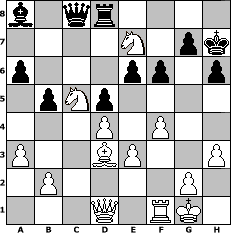 game notation in PGN-format [Event "Stonewall"] [Site "www.myChess.de"] [Date "2017.03.26"] [Round "1"] [White "Seneca"] [Black "Gauss1233"] [ECO "D00"] [WhitemyELO "1497"] [BlackmyELO "1335"] [Result "1-0"] [TimeControl "10/2592000"] [WhiteDays "73"] [BlackDays "84"] [MyChessNo "107590"] 1. d4 d5 2. e3 Nf6 3. Bd3 c5 4. c3 Nc6 5. f4 e6 6. Nd2 cxd4 7. cxd4 Be7 8. a3 O-O 9. Ngf3 Ng4 10. Nb3 h6 11. O-O a6 12. Bd2 b5 13. Rc1 Nf6 14. Rxc6 Bb7 15. Rc2 Rc8 16. Rxc8 Qxc8 17. h3 Ne4 18. Bxe4 Qc7 19. Bd3 Bd8 20. Ba5 Qc8 21. Bxd8 Rxd8 22. Nc5 Ba8 23. Ne5 f6 24. Ng6 Kh7 25. Ne7+ 1-0 position notation in FEN-format b1qr4/4N1pk/p3pp1p/1pNp4/3P1P2/P2BP2P/1P4P1/3Q1RK1 - - - 3 25 Captured white pieces: Captured black pieces: Click on a captured piece in order to display the desired move!