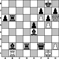 game notation in PGN-format [Event "Krampusturnier"] [Site "www.myChess.de"] [Date "2012.11.25"] [Round "1"] [White "alpacino"] [Black "Papale"] [ECO "C26"] [WhitemyELO "1291"] [BlackmyELO "1583"] [Result "0-1"] [TimeControl "10/1728000"] [WhiteDays "19"] [BlackDays "09"] [MyChessNo "85140"] 1. e4 e5 2. Nc3 Nf6 3. f3 d5 4. Bd3 d4 5. Na4 Be7 6. b3 O-O 7. Bb2 a6 8. Ne2 b5 9. Nac3 dxc3 10. Bxc3 Nbd7 11. O-O Bc5+ 12. Kh1 Nh5 13. b4 Bb6 14. a3 Qh4 15. g3 Qe7 16. Qe1 c5 17. g4 Nhf6 18. bxc5 Nxc5 19. Bb4 Qe6 20. Bxc5 Bxc5 21. Ng3 g6 22. c3 Qe7 23. c4 Rd8 24. Be2 bxc4 25. Bxc4 Bxa3 26. g5 Ne8 27. f4 Bb2 28. Rb1 Nd6 29. Bd5 Rb8 30. f5 Rb5 31. Bc6 Rb6 32. Bd5 Nxf5 33. exf5 Rxd5 34. f6 Qd8 35. Ne4 Bb7 36. Qh4 Rxd2 37. Qh6 Bxe4+ 38. Kg1 Qd4+ 39. Rf2 Qxf2# 0-1 position notation in FEN-format 6k1/5p1p/pr3PpQ/4p1P1/4b3/8/1b1r1q1P/1R4K1 - - - 0 40 Captured white pieces: Captured black pieces: Click on a captured piece in order to display the desired move!