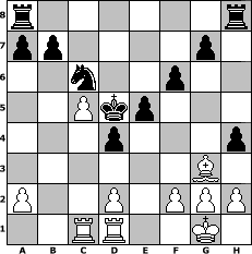 game notation in PGN-format [Event "Winterspiele"] [Site "www.myChess.de"] [Date "2008.12.29"] [Round "1"] [White "Knight"] [Black "ujack1961"] [ECO "D00"] [WhitemyELO "1111"] [BlackmyELO "1688"] [Result "0-1"] [TimeControl "10/864000"] [WhiteDays "27"] [BlackDays "28"] [MyChessNo "51130"] 1. d4 d5 2. e4 c6 3. Nc3 e6 4. e5 Be7 5. Nf3 c5 6. dxc5 Bxc5 7. Bg5 Qb6 8. Qe2 Qxb2 9. Qb5+ Qxb5 10. Nxb5 Na6 11. Nd6+ Bxd6 12. exd6 Nb4 13. Bb5+ Nc6 14. Ne5 Bd7 15. Nxd7 Kxd7 16. O-O Kxd6 17. Rfd1 f6 18. Bf4+ e5 19. Bg3 Nge7 20. c4 d4 21. Bxc6 Nxc6 22. Rab1 h5 23. Rbc1 h4 24. c5+ Kd5 0-1 position notation in FEN-format r6r/pp4p1/2n2p2/2Pkp3/3p3p/6B1/P2P1PPP/2RR2K1 - - - 1 25 Captured white pieces: Captured black pieces: Click on a captured piece in order to display the desired move!