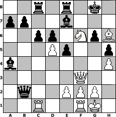 game notation in PGN-format [Event "f"] [Site "www.myChess.de"] [Date "2005.12.25"] [Round "1"] [White "Whiskey40"] [Black "PublicEnemy"] [ECO "C44"] [WhitemyELO "1522"] [BlackmyELO "1469"] [Result "1-0"] [TimeControl "10/864000"] [WhiteDays "10"] [BlackDays "00"] [MyChessNo "21169"] 1. e4 e5 2. Nf3 Nc6 3. d3 h6 4. d4 d6 5. Bb5 Bd7 6. Bxc6 Bxc6 7. Nc3 Nf6 8. d5 Bd7 9. O-O Bg4 10. h3 Bh5 11. Qd3 Be7 12. Nh4 O-O 13. Qg3 Nd7 14. Nf5 Bg6 15. h4 h5 16. a4 Nc5 17. Be3 Nxe4 18. Nxe4 Bxf5 19. Ng5 Bxc2 20. Nf3 g6 21. Bh6 Re8 22. Ng5 c6 23. Rac1 Bxa4 24. Qf3 f6 25. Ne6 Qb6 26. Qg3 Kf7 27. Qf3 Rac8 28. Ng5+ Kg8 29. Ne4 Qxb2 30. Nxf6+ 1-0 position notation in FEN-format 2r1r1k1/pp2b3/2pp1NpB/3Pp2p/b6P/5Q2/1q2PPP1/2R2RK1 - - - 0 30 Captured white pieces: Captured black pieces: Click on a captured piece in order to display the desired move!