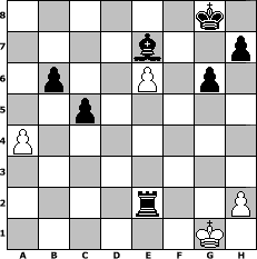 game notation in PGN-format [Event "STHLM"] [Site "www.myChess.de"] [Date "2010.03.25"] [Round "2"] [White "Haki"] [Black "Gauss1233"] [ECO "A08"] [WhitemyELO "1319"] [BlackmyELO "1396"] [Result "0-1"] [TimeControl "10/1728000"] [WhiteDays "80"] [BlackDays "80"] [MyChessNo "64335"] 1. Nf3 d5 2. g3 c5 3. d3 Nc6 4. Nbd2 e5 5. Bg2 Nf6 6. O-O Be7 7. Re1 O-O 8. e4 d4 9. Nc4 Qc7 10. Ncxe5 Nxe5 11. Nxe5 Qxe5 12. Bf4 Qe6 13. e5 Nd5 14. a3 Nxf4 15. gxf4 Rb8 16. Qf3 Qg4 17. Qxg4 Bxg4 18. c3 dxc3 19. bxc3 b6 20. Re4 Rfd8 21. Bf1 Bf5 22. Re3 Rbc8 23. c4 Rd4 24. Bh3 Bxh3 25. Rxh3 Rcd8 26. Rf3 Rxd3 27. Rxd3 Rxd3 28. Kf1 Rc3 29. Rd1 Rxc4 30. Rd7 Kf8 31. Rxa7 g6 32. a4 Rxf4 33. Ra8+ Kg7 34. Ra7 Bh4 35. e6 Rxf2+ 36. Kg1 Re2 37. Rxf7+ Kg8 38. Re7 Bxe7 0-1 position notation in FEN-format 6k1/4b2p/1p2P1p1/2p5/P7/8/4r2P/6K1 - - - 0 39 Captured white pieces: Captured black pieces: Click on a captured piece in order to display the desired move!