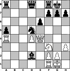 game notation in PGN-format [Event "Schach dem Nikolaus VII"] [Site "www.myChess.de"] [Date "2020.11.23"] [Round "1"] [White "kalle"] [Black "Grubengeist"] [ECO "D11"] [WhitemyELO "1529"] [BlackmyELO "2043"] [Result "0-1"] [TimeControl "10/2592000"] [WhiteDays "29"] [BlackDays "30"] [MyChessNo "119994"] 1. d4 d5 2. c4 c6 3. Nf3 dxc4 4. e4 b5 5. a4 e6 6. axb5 cxb5 7. b3 Nf6 8. bxc4 Nxe4 9. Bd3 Bb7 10. O-O bxc4 11. Bxc4 Be7 12. Qc2 O-O 13. Bd3 Nf6 14. Nbd2 Nc6 15. Ne4 Nxe4 16. Bxe4 Nb4 17. Qb1 Bxe4 18. Qxe4 a5 19. Bd2 Nd5 20. Ra4 Bb4 21. h3 Bxd2 0-1 position notation in FEN-format r2q1rk1/5ppp/4p3/p2n4/R2PQ3/5N1P/3b1PP1/5RK1 - - - 0 22 Captured white pieces: ![]() ![]() ![]() ![]() ![]() ![]() ![]() ![]() ![]() ![]() ![]() ![]() ![]() ![]() ![]() Captured black pieces: ![]() ![]() ![]() ![]() ![]() ![]() ![]() ![]() ![]() ![]() ![]() ![]() ![]() ![]() ![]() Click on a captured piece in order to display the desired move!