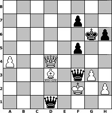 game notation in PGN-format [Event "PUNSCH-Turnier"] [Site "www.myChess.de"] [Date "2010.10.18"] [Round "1"] [White "beowulf"] [Black "lotchi"] [ECO "D11"] [WhitemyELO "1347"] [BlackmyELO "1291"] [Result "0-1"] [TimeControl "10/2592000"] [WhiteDays "30"] [BlackDays "30"] [MyChessNo "69043"] 1. d4 d5 2. c4 c6 3. Nf3 Nf6 4. Bg5 h6 5. Bxf6 gxf6 6. Nc3 dxc4 7. e4 b5 8. a3 f5 9. e5 e6 10. g3 Nd7 11. Bg2 Bb7 12. O-O Bg7 13. b3 a6 14. bxc4 bxc4 15. Qa4 Nb6 16. Qb4 a5 17. Qb2 O-O 18. Rab1 Ra6 19. Rfd1 Qe7 20. Rd2 Qc7 21. Qc1 Qd7 22. Rdb2 Qc7 23. Qc2 Rd8 24. Na4 c5 25. Nxc5 Ra7 26. Rxb6 Bxf3 27. Bxf3 Rxd4 28. Rb7 Rxb7 29. Nxb7 Qxe5 30. Rd1 Rxd1+ 31. Bxd1 Qc7 32. Bf3 c3 33. Bg2 Bf8 34. a4 e5 35. Bd5 Qd7 36. Bg2 Bb4 37. Qb3 e4 38. Nxa5 Bxa5 39. Bf1 Qd2 40. Qb8+ Kg7 41. Qe5+ Kg6 42. Qxa5 e3 43. fxe3 Qxe3+ 44. Kg2 c2 45. Qa6+ Qe6 46. Qa8 c1=Q 47. Qg8+ Kf6 48. Qd8+ Kg7 49. Qd4+ Kg6 50. Bd3 Qd2+ 51. Kf3 Qd1+ 52. Kg2 Qc6+ 53. Kf2 Qcf3# 0-1 position notation in FEN-format 8/5p2/6kp/5p2/P2Q4/3B1qP1/5K1P/3q4 - - - 14 54 Captured white pieces: Captured black pieces: Click on a captured piece in order to display the desired move!