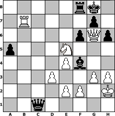 game notation in PGN-format [Event "Abwrackturnier"] [Site "www.myChess.de"] [Date "2009.04.16"] [Round "1"] [White "Zargoz"] [Black "Knight"] [ECO "C68"] [WhitemyELO "1444"] [BlackmyELO "1064"] [Result "1-0"] [TimeControl "10/864000"] [WhiteDays "16"] [BlackDays "35"] [MyChessNo "54893"] 1. e4 e5 2. Nf3 Nc6 3. Bb5 a6 4. Bxc6 dxc6 5. O-O Bg4 6. d3 Nf6 7. Bg5 Be7 8. Bxf6 Bxf6 9. Nbd2 O-O 10. h3 Bxf3 11. Qxf3 b5 12. c4 bxc4 13. Nxc4 Re8 14. b4 h6 15. Rac1 Bg5 16. Rc2 Qd4 17. a3 c5 18. Rb1 cxb4 19. axb4 Rab8 20. Rbb2 c5 21. bxc5 Rxb2 22. Rxb2 Qxc5 23. Rb7 Rf8 24. Qf5 a5 25. Nxe5 f6 26. Qg6 Qc1+ 27. Kh2 Qf4+ 28. Kg1 Qc1+ 29. Kh2 Bf4+ 30. g3 1-0 position notation in FEN-format 5rk1/1R4p1/5pQp/p3N3/4Pb2/3P2PP/4PP1K/2q5 - - - 0 30 Captured white pieces: ![]() ![]() ![]() ![]() ![]() ![]() ![]() ![]() ![]() ![]() ![]() ![]() ![]() ![]() ![]() Captured black pieces: ![]() ![]() ![]() ![]() ![]() ![]() ![]() ![]() ![]() ![]() ![]() ![]() ![]() ![]() ![]() Click on a captured piece in order to display the desired move!