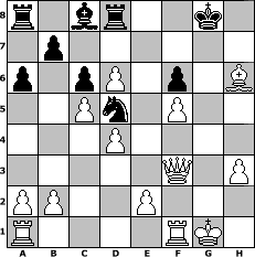 game notation in PGN-format [Event "Herbstman"] [Site "www.myChess.de"] [Date "2015.11.01"] [Round "1"] [White "Caligula"] [Black "wiesel"] [ECO "B00"] [WhitemyELO "1350"] [BlackmyELO "1267"] [Result "1-0"] [TimeControl "10/2592000"] [WhiteDays "23"] [BlackDays "30"] [MyChessNo "101010"] 1. e4 Nc6 2. Nf3 e5 3. Bb5 Qf6 4. Nc3 a6 5. Nd5 Qd6 6. Bxc6 Qxc6 7. Nxe5 Qd6 8. d4 Nf6 9. Nc4 Qb4+ 10. Nxb4 Bxb4+ 11. c3 Be7 12. e5 Nd5 13. O-O h6 14. f4 d6 15. Qf3 c6 16. Nxd6+ Bxd6 17. exd6 Nf6 18. h3 O-O 19. g4 Rd8 20. g5 Nd5 21. c4 Nb6 22. c5 Nd5 23. gxh6 gxh6 24. f5 f6 25. Bxh6 1-0 position notation in FEN-format r1br2k1/1p6/p1pP1p1B/2Pn1P2/3P4/5Q1P/PP2P3/R4RK1 - - - 0 25 Captured white pieces: Captured black pieces: Click on a captured piece in order to display the desired move!