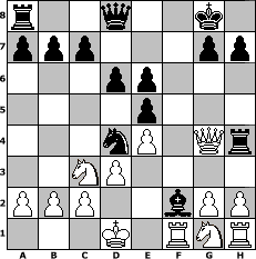 game notation in PGN-format [Event "Make myChess great again...."] [Site "www.myChess.de"] [Date "2017.02.11"] [Round "1"] [White "Schefsche"] [Black "pepo47"] [ECO "B02"] [WhitemyELO "1376"] [BlackmyELO "2075"] [Result "0-1"] [TimeControl "10/864000"] [WhiteDays "14"] [BlackDays "20"] [MyChessNo "106859"] 1. e4 Nf6 2. Nc3 e5 3. Bc4 Bc5 4. d3 d6 5. Bg5 Be6 6. Bxe6 fxe6 7. Qf3 O-O 8. Bxf6 Rxf6 9. Qh3 Bxf2+ 10. Ke2 Nc6 11. Rf1 Nd4+ 12. Kd1 Rh6 13. Qg4 Rh4 0-1 position notation in FEN-format r2q2k1/ppp3pp/3pp3/4p3/3nP1Qr/2NP4/PPP2bPP/3K1RNR - - - 8 14 Captured white pieces: Captured black pieces: Click on a captured piece in order to display the desired move!