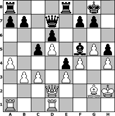 game notation in PGN-format [Event "martinus Open"] [Site "www.myChess.de"] [Date "2010.06.02"] [Round "1"] [White "herieg26928 (adv.)"] [Black "Lemmi11"] [ECO "A22"] [WhitemyELO "1833"] [BlackmyELO "1772"] [Result "1/2-1/2"] [TimeControl "10/1728000"] [WhiteDays "42"] [BlackDays "60"] [MyChessNo "66013"] 1. c4 e5 2. Nc3 Nf6 3. Nf3 Nc6 4. g3 Bb4 5. Bg2 O-O 6. O-O e4 7. Ng5 Bxc3 8. dxc3 Re8 9. Qc2 Qe7 10. Nh3 h6 11. Nf4 Qe5 12. Rd1 Ne7 13. Be3 c5 14. Nd5 Nexd5 15. cxd5 d6 16. Bf4 Qe7 17. h3 Bf5 18. g4 Bg6 19. Qd2 h5 20. g5 Nd7 21. h4 Ne5 22. b3 Ng4 23. f3 Ne5 24. Bxe5 Qxe5 25. f4 Qf5 26. e3 Qd7 27. a4 Bf5 28. Kh2 1/2-1/2 position notation in FEN-format r3r1k1/pp1q1pp1/3p4/2pP1bPp/P3pP1P/1PP1P3/3Q2BK/R2R4 - - - 2 28 Captured white pieces: Captured black pieces: Click on a captured piece in order to display the desired move!