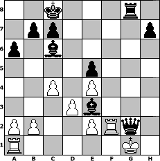 game notation in PGN-format [Event "Ostdeutschland"] [Site "www.myChess.de"] [Date "2008.08.12"] [Round "1"] [White "paul"] [Black "muellerh"] [ECO "C62"] [WhitemyELO "1280"] [BlackmyELO "1519"] [Result "0-1"] [TimeControl "10/2592000"] [WhiteDays "34"] [BlackDays "82"] [MyChessNo "47130"] 1. e4 e5 2. Nf3 Nc6 3. Bb5 d6 4. Nc3 Bd7 5. O-O Qe7 6. Nd5 Qd8 7. d3 Nf6 8. Bg5 Be7 9. c4 a6 10. Bxc6 Bxc6 11. Nxf6+ gxf6 12. Bh6 Qd7 13. h3 O-O-O 14. Be3 Rhg8 15. Nh4 Qxh3 16. Qh5 Rxg2+ 17. Nxg2 Qxh5 18. f4 Rg8 19. Rf2 f5 20. fxe5 dxe5 21. Rxf5 Qh3 22. Bg5 Bxg5 23. Rxf7 Be3+ 24. Rf2 Qxg2# 0-1 position notation in FEN-format 2k3r1/1pp4p/p1b5/4p3/2P1P3/3Pb3/PP2PRq1/R5K1 - - - 0 25 Captured white pieces: ![]() ![]() ![]() ![]() ![]() ![]() ![]() ![]() ![]() ![]() ![]() ![]() ![]() ![]() ![]() Captured black pieces: ![]() ![]() ![]() ![]() ![]() ![]() ![]() ![]() ![]() ![]() ![]() ![]() ![]() ![]() ![]() Click on a captured piece in order to display the desired move!