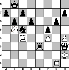 game notation in PGN-format [Event "7. HK-960-Pokal"] [Site "www.myChess.de"] [Date "2013.08.07"] [Round "2"] [White "Hobbykegler"] [Black "Seneca"] [Variant "Fischerrandom"] [SetUp "1"] [FEN "bnnrkrqb/pppppppp/8/8/8/8/PPPPPPPP/BNNRKRQB w KQkq - 0 1"] [WhitemyELO "1056"] [BlackmyELO "1538"] [Result "0-1"] [TimeControl "10/3456000"] [WhiteDays "40"] [BlackDays "40"] [MyChessNo "89578"] 1. g4 g6 2. Qg3 Nc6 3. c3 d6 4. Nd3 Nb6 5. b4 Ne5 6. Nxe5 Bxe5 7. Qe3 O-O-O 8. g5 f6 9. gxf6 exf6 10. f4 Qxa2 11. d4 Qxa1 12. Nd2 Qa2 13. Bg2 Bxd4 14. Qxd4 Qe6 15. h4 Qg4 16. Qf2 Kb8 17. Ne4 Qe6 18. Rd4 Qb3 19. Nd2 Qxc3 20. O-O f5 21. b5 Qc5 22. Nb3 Qxb5 23. Nd2 Qc5 24. e3 Nc8 25. Rb1 b6 26. Bxa8 Kxa8 27. Nb3 Qc6 28. Rc1 Qb7 29. Qc2 Kb8 30. Rc4 Rd7 31. Kf2 Ne7 32. Kg3 Nd5 33. Qd3 Nf6 34. Nd4 Ne4+ 35. Kh2 Nc5 36. Qc3 Re8 37. Nb5 Rde7 38. Kh3 Rxe3+ 39. Qxe3 Rxe3+ 40. Kh2 Qf3 41. Rg1 Qh3# 0-1 position notation in FEN-format 1k6/p1p4p/1p1p2p1/1Nn2p2/2R2P1P/4r2q/7K/6R1 - - - 4 42 Captured white pieces: Captured black pieces: Click on a captured piece in order to display the desired move!