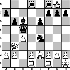 game notation in PGN-format [Event "Herbstturnier 2004"] [Site "www.myChess.de"] [Date "2004.09.02"] [Round "2"] [White "Narkon"] [Black "helrobe"] [ECO "A40"] [WhitemyELO "1408"] [BlackmyELO "1601"] [Result "0-1"] [TimeControl "10/2592000"] [WhiteDays "39"] [BlackDays "60"] [MyChessNo "6536"] 1. d4 e6 2. e4 d5 3. Nc3 dxe4 4. Nxe4 Nf6 5. Bg5 Be7 6. Nf3 Nxe4 7. Bxe7 Qxe7 8. Bd3 Nf6 9. O-O O-O 10. Ne5 Nbd7 11. Nxd7 Bxd7 12. c4 Rad8 13. Qb3 b6 14. Be2 c5 15. dxc5 Qxc5 16. Rad1 Bc6 17. Kh1 Ne4 0-1 position notation in FEN-format 3r1rk1/p4ppp/1pb1p3/2q5/2P1n3/1Q6/PP1PBPPP/3R1R1K - - - 4 18 Captured white pieces: ![]() ![]() ![]() ![]() ![]() ![]() ![]() ![]() ![]() ![]() ![]() ![]() ![]() ![]() ![]() Captured black pieces: ![]() ![]() ![]() ![]() ![]() ![]() ![]() ![]() ![]() ![]() ![]() ![]() ![]() ![]() ![]() Click on a captured piece in order to display the desired move!