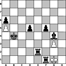 game notation in PGN-format [Event "Munich South Central"] [Site "www.myChess.de"] [Date "2010.10.19"] [Round "2"] [White "Achimkogge"] [Black "Winston"] [ECO "B20"] [WhitemyELO "1325"] [BlackmyELO "1420"] [Result "0-1"] [TimeControl "10/864000"] [WhiteDays "64"] [BlackDays "70"] [MyChessNo "69151"] 1. e4 c5 2. d4 cxd4 3. Qxd4 Nc6 4. Qd1 a6 5. c3 h6 6. Bc4 Nf6 7. Qf3 Qb6 8. Ne2 e6 9. a3 Ne5 10. Qe3 Bc5 11. Qg3 Nfg4 12. Nd4 O-O 13. Be2 f5 14. O-O Bxd4 15. cxd4 Qxd4 16. Nc3 b5 17. h3 h5 18. hxg4 hxg4 19. Be3 Qd6 20. Rad1 Qc7 21. Bf4 d6 22. exf5 exf5 23. f3 Be6 24. Kh2 Kf7 25. Bg5 Rh8+ 26. Kg1 Rh5 27. Bf4 Rah8 28. Be3 Ke8 29. Rc1 Qe7 30. f4 Ng6 31. Bd4 Kf7 32. b4 Bd7 33. Rce1 Bc6 34. Bc4+ bxc4 35. Rxe7+ Kxe7 36. Bxg7 R8h7 37. Qe3+ Kf7 38. Qa7+ Ne7 39. Bd4 g3 40. Qxe7+ Kxe7 41. Re1+ Kd7 42. Kf1 Rh1+ 43. Bg1 R7h4 44. Ne2 Bb5 45. Nxg3 c3+ 46. Kf2 Rxf4+ 47. Ke3 Rhh4 48. Rc1 d5 49. Ne2 Re4+ 50. Kf3 Bxe2+ 51. Kg3 Rc4 52. Be3 Rhe4 53. Kf2 Bg4 54. g3 c2 55. Rh1 Rc3 56. Rh7+ Kc6 57. Rh6+ Kb5 58. Bc1 Rf3+ 59. Kg2 Re2+ 60. Kg1 Re1+ 61. Kg2 Rxc1 62. Rh1 Rd1 63. a4+ Kxb4 64. Rxd1 cxd1=Q 65. a5 Qe2+ 66. Kg1 Rf1# 0-1 position notation in FEN-format 8/8/p7/P2p1p2/1k4b1/6P1/4r3/5rK1 - - - 3 67 Captured white pieces: Captured black pieces: Click on a captured piece in order to display the desired move!