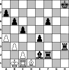 game notation in PGN-format [Event "NoEngine02"] [Site "www.myChess.de"] [Date "2007.11.17"] [Round "2"] [White "Tommy6"] [Black "Andreas"] [ECO "C45"] [WhitemyELO "1494"] [BlackmyELO "1548"] [Result "0-1"] [TimeControl "10/1728000"] [WhiteDays "20"] [BlackDays "20"] [MyChessNo "39901"] 1. e4 e5 2. Nf3 Nc6 3. d4 exd4 4. Nxd4 Bc5 5. Nb3 Bb6 6. Nc3 Qf6 7. Qe2 Nge7 8. Be3 Bxe3 9. Qxe3 O-O 10. O-O-O Re8 11. f4 d6 12. h3 g6 13. g4 Qh4 14. Bg2 b6 15. f5 Ne5 16. Nd2 Ba6 17. Nf3 Nxf3 18. Bxf3 Rad8 19. Rdg1 Nc6 20. g5 gxf5 21. Nd5 Re5 22. Nf6+ Kh8 23. Rg4 fxg4 24. Nxg4 Qxg5 25. Qxg5 Rxg5 26. e5 Nxe5 27. Nxe5 dxe5 28. Re1 Rg6 29. b3 f6 30. Kb2 Rd2 31. Kc3 Rf2 32. Bg4 c5 33. a4 h5 34. Bxh5 Rg3+ 35. Kb2 Bd3 36. Rc1 Rxh3 37. Bd1 e4 38. Kb1 Be2 0-1 position notation in FEN-format 7k/p7/1p3p2/2p5/P3p3/1P5r/2P1br2/1KRB4 - - - 2 39 Captured white pieces: Captured black pieces: Click on a captured piece in order to display the desired move!