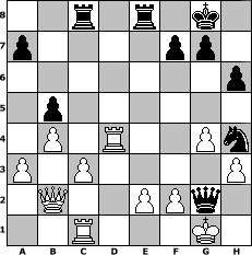 game notation in PGN-format [Event "XII. Klub-Meisterschaft -Die Wikinger-"] [Site "www.myChess.de"] [Date "2016.05.01"] [Round "1"] [White "borsti"] [Black "Oste152V4"] [ECO "C02"] [WhitemyELO "1235"] [BlackmyELO "1523"] [Result "0-1"] [TimeControl "10/2592000"] [WhiteDays "30"] [BlackDays "29"] [MyChessNo "103478"] 1. e4 e6 2. d4 d5 3. e5 c5 4. Bb5+ Bd7 5. Nc3 Qb6 6. Ba4 cxd4 7. Bxd7+ Nxd7 8. Nxd5 exd5 9. Nf3 Bb4+ 10. Nd2 Ne7 11. a3 Bxd2+ 12. Qxd2 Nxe5 13. O-O O-O 14. b4 Rac8 15. Bb2 Nc4 16. Qxd4 Nxb2 17. Qxb2 d4 18. Rfd1 Nf5 19. Rd3 Qc6 20. Rc1 h6 21. h3 Rfe8 22. c3 b5 23. g4 Nh4 24. Rxd4 Qg2# 0-1 position notation in FEN-format 2r1r1k1/p4pp1/7p/1p6/1P1R2Pn/P1P4P/1Q2PPq1/2R3K1 - - - 1 25 Captured white pieces: Captured black pieces: Click on a captured piece in order to display the desired move!