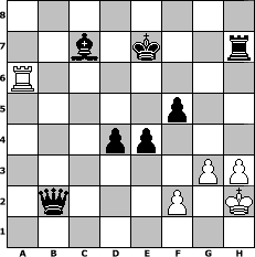 game notation in PGN-format [Event "wie w"] [Site "www.myChess.de"] [Date "2013.11.16"] [Round "1"] [White "Winston"] [Black "Duschgel"] [ECO "B10"] [WhitemyELO "1550"] [BlackmyELO "1587"] [Result "0-1"] [TimeControl "10/1728000"] [WhiteDays "20"] [BlackDays "20"] [MyChessNo "91163"] 1. e4 c6 2. e5 d5 3. d4 c5 4. dxc5 Nc6 5. Bb5 e6 6. b4 Bd7 7. Bxc6 Bxc6 8. Nf3 a5 9. c3 axb4 10. cxb4 b6 11. Be3 bxc5 12. bxc5 Qa5+ 13. Nbd2 Ba4 14. Qc1 Bb5 15. a3 Ne7 16. Nd4 Nc6 17. Nxc6 Bxc6 18. O-O Be7 19. Nb3 Qa4 20. Nd4 Kd7 21. Nxc6 Kxc6 22. Qc3 Rhb8 23. Qd3 g6 24. Rfc1 Rb3 25. Rc3 Rab8 26. h3 Rxc3 27. Qxc3 Rb3 28. Qc1 Qe4 29. Qf1 Qxe5 30. Qa6+ Kc7 31. Rc1 Qb2 32. a4 Rxe3 33. Qa7+ Kd8 34. Qa8+ Kd7 35. c6+ Kd6 36. Rf1 Rc3 37. Qh8 Rc2 38. Qxh7 Qf6 39. Qg8 Bd8 40. Qf8+ Qe7 41. Qh6 Kxc6 42. Qe3 Rc4 43. Qb3 Qb4 44. Qf3 Rf4 45. Rc1+ Kd7 46. Qd1 Bb6 47. Rc2 Qxa4 48. Qb1 Qd4 49. Qb5+ Ke7 50. Qf1 e5 51. Qe1 e4 52. Re2 Kd6 53. Rd2 Qc5 54. Re2 f5 55. Qd2 Ke5 56. Qb2+ d4 57. Kh2 Kd6 58. Rc2 Qa5 59. Qc1 Ke5 60. Qb2 Rh4 61. Rc8 Rh7 62. Re8+ Kd6 63. Rg8 Bc7 64. g3 Qc3 65. Rxg6+ Ke7 66. Ra6 Qxb2 0-1 position notation in FEN-format 8/2b1k2r/R7/5p2/3pp3/6PP/1q3P1K/8 - - - 0 67 Captured white pieces: Captured black pieces: Click on a captured piece in order to display the desired move!