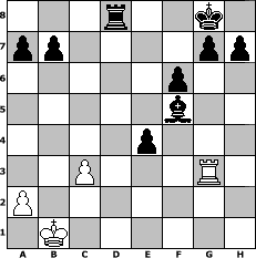 game notation in PGN-format [Event "mal spielen ohne drogen oder der k"] [Site "www.myChess.de"] [Date "2006.04.28"] [Round "1"] [White "Hobbykegler"] [Black "Juliette2103"] [ECO "D00"] [WhitemyELO "1060"] [BlackmyELO "1820"] [Result "0-1"] [TimeControl "10/1728000"] [WhiteDays "66"] [BlackDays "43"] [MyChessNo "24892"] 1. d4 d5 2. Be3 Nf6 3. Nc3 e6 4. Qd3 Nbd7 5. O-O-O c5 6. dxc5 Bxc5 7. Bf4 O-O 8. Nh3 Nh5 9. g4 Nxf4 10. Nxf4 Bxf2 11. Bg2 Ne5 12. Qh3 Qg5 13. e3 Qxg4 14. Qxg4 Bxe3+ 15. Kb1 Nxg4 16. Rhe1 Bxf4 17. h3 Ne3 18. Rd2 Nxg2 19. Rxg2 d4 20. Ne4 e5 21. Nd6 Rd8 22. Nc4 f6 23. Reg1 Bh6 24. Nd2 Bxd2 25. Rxd2 Bxh3 26. c3 dxc3 27. Rxd8+ Rxd8 28. bxc3 e4 29. Rg3 Bf5 0-1 position notation in FEN-format 3r2k1/pp4pp/5p2/5b2/4p3/2P3R1/P7/1K6 - - - 2 30 Captured white pieces: Captured black pieces: Click on a captured piece in order to display the desired move!