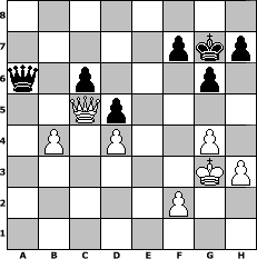 game notation in PGN-format [Event "Die letzten Sommertage!!!"] [Site "www.myChess.de"] [Date "2009.09.12"] [Round "1"] [White "Zargoz"] [Black "Andreas"] [ECO "C61"] [WhitemyELO "1415"] [BlackmyELO "1544"] [Result "1/2-1/2"] [TimeControl "10/864000"] [WhiteDays "37"] [BlackDays "32"] [MyChessNo "58934"] 1. e4 e5 2. Nf3 Nc6 3. Bb5 Nd4 4. Nc3 Nxb5 5. Nxb5 c6 6. Nc3 Nf6 7. Nxe5 Qe7 8. d4 d6 9. Nf3 Nxe4 10. Nxe4 Qxe4+ 11. Be3 Bf5 12. c3 Be7 13. O-O O-O 14. Re1 Qg4 15. h3 Qg6 16. Kh2 Be4 17. Qe2 Bxf3 18. Qxf3 d5 19. Bf4 Bd6 20. Re2 Rae8 21. Rae1 Rxe2 22. Rxe2 Bxf4+ 23. Qxf4 Qd3 24. Qe5 Qa6 25. a3 Qb5 26. Qe7 a5 27. b4 axb4 28. axb4 b6 29. Ra2 g6 30. Ra7 Qc4 31. Rd7 Qxc3 32. Rd8 Rxd8 33. Qxd8+ Kg7 34. Qxb6 Qc4 35. g4 Qc2 36. Kg3 Qc3+ 37. Kg2 Qc4 38. Qc5 Qa6 39. Kg3 1/2-1/2 position notation in FEN-format 8/5pkp/q1p3p1/2Qp4/1P1P2P1/6KP/5P2/8 - - - 8 39 Captured white pieces: ![]() ![]() ![]() ![]() ![]() ![]() ![]() ![]() ![]() ![]() ![]() ![]() ![]() ![]() ![]() Captured black pieces: ![]() ![]() ![]() ![]() ![]() ![]() ![]() ![]() ![]() ![]() ![]() ![]() ![]() ![]() ![]() Click on a captured piece in order to display the desired move!