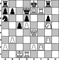 game notation in PGN-format [Event "In Memorium Michael Knopf 2"] [Site "www.myChess.de"] [Date "2013.04.10"] [Round "1"] [White "Duschgel"] [Black "borsti"] [ECO "A20"] [WhitemyELO "1624"] [BlackmyELO "1211"] [Result "1-0"] [TimeControl "10/2592000"] [WhiteDays "83"] [BlackDays "90"] [MyChessNo "87703"] 1. c4 e5 2. g3 Nf6 3. Bg2 c6 4. d4 e4 5. d5 c5 6. Nc3 Qa5 7. Bd2 Qb4 8. Qc2 Qxc4 9. b3 Qd4 10. Be3 Qe5 11. Bf4 Qe7 12. Nxe4 Nxe4 13. Bxe4 d6 14. Nf3 Bg4 15. O-O-O g6 16. Bg5 Qd7 17. Bf6 Rg8 18. h3 Bxh3 19. Ng5 Bf5 20. Rxh7 Bxe4 21. Qxe4+ Be7 22. Rxf7 Na6 23. Bxe7 1-0 position notation in FEN-format r3k1r1/pp1qBR2/n2p2p1/2pP2N1/4Q3/1P4P1/P3PP2/2KR4 - q - 0 23 Captured white pieces: Captured black pieces: Click on a captured piece in order to display the desired move!