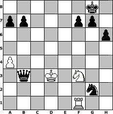 game notation in PGN-format [Event "Drachenboote auf dem Rhein"] [Site "www.myChess.de"] [Date "2009.07.15"] [Round "1"] [White "Zargoz"] [Black "neve"] [ECO "B01"] [WhitemyELO "1389"] [BlackmyELO "1516"] [Result "0-1"] [TimeControl "10/1728000"] [WhiteDays "16"] [BlackDays "20"] [MyChessNo "57457"] 1. e4 d5 2. exd5 Nf6 3. c4 c6 4. dxc6 Nxc6 5. d3 e5 6. Nc3 Bc5 7. Be3 Nd4 8. Bxd4 Bxd4 9. Nf3 Bg4 10. Be2 Qb6 11. Qd2 Bxf2+ 12. Kf1 Be3 13. Qc2 Qe6 14. Qa4+ Nd7 15. Nd5 Bb6 16. Nxb6 Qxb6 17. b3 O-O 18. b4 Nf6 19. Nxe5 Bxe2+ 20. Kxe2 Qd4 21. Nf3 Rfe8+ 22. Kd2 Ne4+ 23. Kc2 Qc3+ 24. Kb1 Qxd3+ 25. Qc2 Nc3+ 26. Kc1 Qxc4 27. Kb2 Re2 28. Nd2 Qxb4+ 29. Kc1 Rd8 30. a3 Qd4 31. Nf3 Rxc2+ 32. Kxc2 Qf6 33. Rhe1 Rc8 34. Kd3 Qg6+ 35. Kd2 Qxg2+ 36. Ke3 h6 37. a4 Re8+ 38. Kd4 Rxe1 39. Nxe1 Ne2+ 40. Kd3 Nf4+ 41. Ke3 Qxh2 42. Nf3 Qb2 43. Rf1 Ng2+ 44. Kd3 Qb3+ 0-1 position notation in FEN-format 6k1/pp3pp1/7p/8/P7/1q1K1N2/6n1/5R2 - - - 6 45 Captured white pieces: Captured black pieces: Click on a captured piece in order to display the desired move!