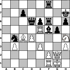 game notation in PGN-format [Event "Pfingst -Turnier"] [Site "www.myChess.de"] [Date "2009.05.30"] [Round "1"] [White "Fussel"] [Black "Caligula"] [ECO "D02"] [WhitemyELO "1258"] [BlackmyELO "1264"] [Result "0-1"] [TimeControl "10/2592000"] [WhiteDays "00"] [BlackDays "90"] [MyChessNo "56167"] 1. d4 d5 2. Nf3 Nf6 3. b3 e6 4. c4 Nc6 5. cxd5 Bb4+ 6. Bd2 Bxd2+ 7. Nbxd2 Qxd5 8. e3 O-O 9. Bc4 Qd6 10. h3 a6 11. O-O b5 12. Bd3 Bb7 13. Ne4 Nxe4 14. Bxe4 f5 15. Bd3 Rad8 16. a4 Nb4 17. Be2 Be4 18. axb5 axb5 19. Bxb5 Rb8 20. Bc4 h6 21. Nh4 Kh7 22. Qh5 Rf6 23. g4 fxg4 24. Qxg4 Bg6 25. Ra5 Rbf8 26. Re5 Bf5 27. Qg2 g5 0-1 position notation in FEN-format 5r2/2p4k/3qpr1p/4Rbp1/1nBP3N/1P2P2P/5PQ1/5RK1 - - - 0 28 Captured white pieces: ![]() ![]() ![]() ![]() ![]() ![]() ![]() ![]() ![]() ![]() ![]() ![]() ![]() ![]() ![]() Captured black pieces: ![]() ![]() ![]() ![]() ![]() ![]() ![]() ![]() ![]() ![]() ![]() ![]() ![]() ![]() ![]() Click on a captured piece in order to display the desired move!