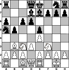 game notation in PGN-format [Event "Rechnerfrei A"] [Site "www.myChess.de"] [Date "2010.02.05"] [Round "1"] [White "Steppenwolf"] [Black "Caligula"] [ECO "C46"] [WhitemyELO "1245"] [BlackmyELO "1420"] [Result "0-1"] [TimeControl "10/1728000"] [WhiteDays "00"] [BlackDays "20"] [MyChessNo "62901"] 1. e4 e5 2. Nf3 Nc6 3. Nc3 d6 4. Bb5 Bd7 5. d3 Be7 6. O-O a6 7. Ba4 b5 8. Bb3 Na5 9. Re1 c6 0-1 position notation in FEN-format r2qk1nr/3bbppp/p1pp4/np2p3/4P3/1BNP1N2/PPP1PPPP/R1BQR1K1 - kq - 0 10 Captured white pieces: Captured black pieces: Click on a captured piece in order to display the desired move!