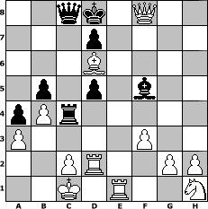 game notation in PGN-format [Event "960"] [Site "www.myChess.de"] [Date "2009.12.20"] [Round "1"] [White "Robert"] [Black "Hobbykegler"] [Variant "Fischerrandom"] [SetUp "1"] [FEN "qrnkbbrn/pppppppp/8/8/8/8/PPPPPPPP/QRNKBBRN w KQkq - 0 1"] [WhitemyELO "1573"] [BlackmyELO "1060"] [Result "1-0"] [TimeControl "10/2592000"] [WhiteDays "52"] [BlackDays "75"] [MyChessNo "61686"] 1. Ng3 g5 2. d4 b6 3. e4 Bg7 4. Bc3 Nd6 5. Bd3 b5 6. a3 Ng6 7. Nce2 f5 8. Nxf5 Nxf5 9. exf5 Nh4 10. Neg3 Bf7 11. Be4 c6 12. b3 e6 13. fxe6 Bxe6 14. O-O-O Rf8 15. f3 Rb6 16. d5 cxd5 17. Bxg7 Rf7 18. Bxh7 a5 19. Qe5 a4 20. b4 Qc8 21. Qxg5+ Ke8 22. Bg6 Nxg6 23. Rge1 Rc6 24. Qxg6 Qc7 25. Be5 Qc8 26. Rd2 Rc4 27. Nf5 Bxf5 28. Bd6+ Kd8 29. Qg8+ Rf8 30. Qxf8# 1-0 position notation in FEN-format 2qk1Q2/3p4/3B4/1p1p1b2/pPr5/P4P2/2PR2PP/2K1R2N - - - 0 30 Captured white pieces: ![]() ![]() ![]() ![]() ![]() ![]() ![]() ![]() ![]() ![]() ![]() ![]() ![]() ![]() ![]() Captured black pieces: ![]() ![]() ![]() ![]() ![]() ![]() ![]() ![]() ![]() ![]() ![]() ![]() ![]() ![]() ![]() Click on a captured piece in order to display the desired move!