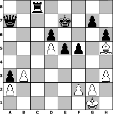 game notation in PGN-format [Event "Auf bessere Zeiten!!"] [Site "www.myChess.de"] [Date "2020.05.07"] [Round "1"] [White "beowulf"] [Black "S04boy"] [ECO "A10"] [WhitemyELO "1386"] [BlackmyELO "1282"] [Result "0-1"] [TimeControl "10/864000"] [WhiteDays "40"] [BlackDays "30"] [MyChessNo "118242"] 1. c4 d6 2. d4 Nf6 3. Nc3 c6 4. Bg5 e5 5. d5 h6 6. Bxf6 Qxf6 7. e4 Nd7 8. Nf3 Nb6 9. Be2 Bg4 10. O-O Bxf3 11. Bxf3 Nxc4 12. Qc2 b5 13. b3 Na3 14. Qe2 b4 15. Nb1 cxd5 16. Nxa3 bxa3 17. Qb5+ Kd8 18. exd5 Be7 19. Rac1 Qf5 20. h3 Qd7 21. Rc6 Rc8 22. Rfc1 Rxc6 23. Rxc6 Ke8 24. Qb8+ Bd8 25. Rc8 Ke7 26. Bg4 f5 27. Bh5 Bc7 28. Qxc7 Rxc8 29. Qxa7 Qxa7 0-1 position notation in FEN-format 2r5/q3k1p1/3p3p/3Ppp1B/8/pP5P/P4PP1/6K1 - - - 0 30 Captured white pieces: Captured black pieces: Click on a captured piece in order to display the desired move!