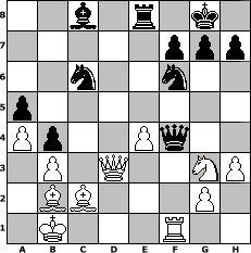 game notation in PGN-format [Event "Winter 2018"] [Site "www.myChess.de"] [Date "2018.01.10"] [Round "1"] [White "larlinde"] [Black "jeremyt"] [ECO "E46"] [WhitemyELO "2146"] [BlackmyELO "2125"] [Result "1-0"] [TimeControl "10/2592000"] [WhiteDays "54"] [BlackDays "63"] [MyChessNo "110994"] 1. d4 Nf6 2. c4 e6 3. Nc3 Bb4 4. e3 O-O 5. Qc2 b6 6. Bd3 Bb7 7. e4 c5 8. d5 b5 9. b3 d6 10. Nge2 Nbd7 11. f4 Bxc3+ 12. Qxc3 a5 13. a4 b4 14. Qd2 Qe7 15. Bb2 Ng4 16. Ng3 Qh4 17. O-O-O Rad8 18. Bc2 Rfe8 19. Kb1 Nf8 20. Rdf1 Bc8 21. Rf3 exd5 22. Qxd5 Ng6 23. Qd2 Ne7 24. Rd3 Nc6 25. h3 Nf6 26. Qe3 d5 27. Qxc5 dxc4 28. Qxc4 Rxd3 29. Qxd3 Qxf4 30. Rf1 1-0 position notation in FEN-format 2b1r1k1/5ppp/2n2n2/p7/Pp2Pq2/1P1Q2NP/1BB3P1/1K3R2 - - - 1 30 Captured white pieces: Captured black pieces: Click on a captured piece in order to display the desired move!