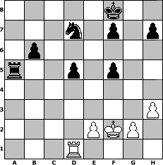 game notation in PGN-format [Event "wie w"] [Site "www.myChess.de"] [Date "2013.11.16"] [Round "1"] [White "lotchi"] [Black "Duschgel"] [ECO "B11"] [WhitemyELO "1175"] [BlackmyELO "1587"] [Result "0-1"] [TimeControl "10/1728000"] [WhiteDays "20"] [BlackDays "20"] [MyChessNo "91150"] 1. e4 c6 2. Nc3 d5 3. d4 g6 4. Nf3 Bg7 5. Bd3 Bg4 6. h3 Bxf3 7. Qxf3 dxe4 8. Nxe4 Bxd4 9. c3 Bg7 10. Bc4 e6 11. Bg5 Qa5 12. Bd2 Ne7 13. a4 Nd7 14. b4 Qc7 15. Qg3 Be5 16. f4 Bg7 17. a5 c5 18. f5 Qxg3+ 19. Nxg3 gxf5 20. O-O cxb4 21. Rac1 bxc3 22. Bxc3 Bxc3 23. Rxc3 Rc8 24. Rfc1 Rg8 25. Rb1 Nd5 26. Rcc1 Rxg3 27. Bxd5 Rxc1+ 28. Rxc1 exd5 29. Re1+ Kf8 30. Kf2 Ra3 31. Rb1 b6 32. axb6 axb6 33. Rd1 Ra5 0-1 position notation in FEN-format 5k2/3n1p1p/1p6/r2p1p2/8/7P/4PKP1/3R4 - - - 2 34 Captured white pieces: Captured black pieces: Click on a captured piece in order to display the desired move!