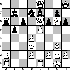 | game notation in PGN-format [Event "Winterturnier"] [Site "www.myChess.de"] [Date "2009.11.12"] [Round "1"] [White "leitsgeheier"] [Black "Caligula"] [ECO "D54"] [WhitemyELO "1527"] [BlackmyELO "1365"] [Result "1-0"] [TimeControl "10/3456000"] [WhiteDays "087"] [BlackDays "120"] [MyChessNo "60563"] 1. d4 d5 2. c4 e6 3. Nc3 Nf6 4. Bg5 Be7 5. e3 Nbd7 6. Nf3 h6 7. Bh4 dxc4 8. Bxc4 Nb6 9. Bd3 O-O 10. O-O Nfd5 11. Bg3 Nxc3 12. bxc3 c6 13. e4 f6 14. c4 Nd7 15. Qb3 b6 16. Rfe1 Bb7 17. c5 Kh8 18. cxb6 axb6 19. Qxe6 b5 20. Nh4 Qe8 21. e5 Ra6 22. Ng6+ Kh7 23. Nxf8+ Kh8 24. Ng6+ 1-0 position notation in FEN-format 4q2k/1b1nb1p1/r1p1QpNp/1p2P3/3P4/3B2B1/P2P1PPP/R3R1K1 - - - 2 24 Captured white pieces:                              Captured black pieces:                               Click on a captured piece in order to display the desired move!