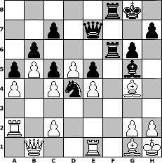 game notation in PGN-format [Event "Ferienspass"] [Site "www.myChess.de"] [Date "2016.07.25"] [Round "1"] [White "ChNe"] [Black "HenrySchinasky"] [ECO "A15"] [WhitemyELO "1625"] [BlackmyELO "2080"] [Result "0-1"] [TimeControl "10/864000"] [WhiteDays "00"] [BlackDays "09"] [MyChessNo "104294"] 1. c4 Nf6 2. d4 g6 3. Nf3 Bg7 4. Nc3 d6 5. e4 O-O 6. Be2 e5 7. d5 a5 8. O-O Na6 9. Be3 Ng4 10. Bg5 f6 11. Bh4 Nh6 12. Nd2 Bd7 13. f3 Nf7 14. Nb3 b6 15. Nc1 Bh6 16. Bf2 f5 17. Nd3 Qe7 18. Qe1 fxe4 19. Nxe4 Nd8 20. b3 Nb7 21. a3 Nac5 22. b4 Nb3 23. Ra2 Nd4 24. Qb1 Qf7 25. b5 Bf5 26. a4 Bxe4 27. fxe4 Qe7 28. Bg4 Rf6 29. Kh1 Raf8 30. Re1 Nc5 31. Bg1 Bg5 32. Nxc5 dxc5 0-1 position notation in FEN-format 5rk1/2p1q2p/1p3rp1/pPpPp1b1/P1PnP1B1/8/R1P3PP/1Q2R1BK - - - 0 33 Captured white pieces: Captured black pieces: Click on a captured piece in order to display the desired move!
