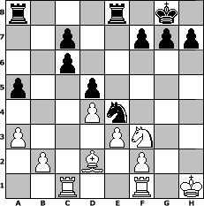 game notation in PGN-format [Event "Trauerspiel :-)"] [Site "www.myChess.de"] [Date "2008.09.20"] [Round "1"] [White "brucybabe"] [Black "Knight"] [ECO "E20"] [WhitemyELO "1684"] [BlackmyELO "1216"] [Result "1-0"] [TimeControl "10/864000"] [WhiteDays "10"] [BlackDays "10"] [MyChessNo "48117"] 1. d4 Nf6 2. c4 e6 3. Nc3 Bb4 4. Bd2 d5 5. e3 Nc6 6. Nf3 O-O 7. Rc1 Re8 8. cxd5 exd5 9. Bb5 Bg4 10. O-O a6 11. Be2 a5 12. a3 Bd6 13. Nb5 Ne4 14. Nxd6 Qxd6 15. h3 Bf5 16. Bb5 Bxh3 17. gxh3 Qg6+ 18. Kh2 Qd6+ 19. Kh1 Qh6 20. Bxc6 Qxh3+ 21. Nh2 bxc6 22. Qf3 Qxf3+ 23. Nxf3 1-0 position notation in FEN-format r3r1k1/2p2ppp/2p5/p2p4/3Pn3/P3PN2/1P1B1P2/2R2R1K - - - 0 23 Captured white pieces: Captured black pieces: Click on a captured piece in order to display the desired move!