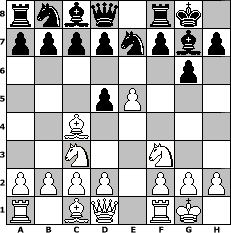 game notation in PGN-format [Event "Winterm"] [Site "www.myChess.de"] [Date "2006.11.29"] [Round "1"] [White "FreshPrinc2"] [Black "Juliette2103"] [ECO "A45"] [WhitemyELO "1671"] [BlackmyELO "1610"] [Result "0-1"] [TimeControl "10/864000"] [WhiteDays "00"] [BlackDays "02"] [MyChessNo "30496"] 1. d4 Nf6 2. Nc3 g6 3. e4 Bg7 4. e5 Ng8 5. Bc4 e6 6. Nf3 Ne7 7. O-O O-O 8. d5 exd5 0-1 position notation in FEN-format rnbq1rk1/ppppnpbp/6p1/3pP3/2B5/2N2N2/PPPP1PPP/R1BQ1RK1 - - - 0 9 Captured white pieces: Captured black pieces: Click on a captured piece in order to display the desired move!