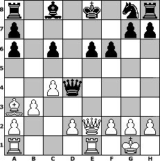 game notation in PGN-format [Event "MySchachOpen"] [Site "www.myChess.de"] [Date "2005.01.22"] [Round "2"] [White "Falcor"] [Black "Bernd"] [ECO "B01"] [WhitemyELO "1337"] [BlackmyELO "1382"] [Result "1-0"] [TimeControl "10/2592000"] [WhiteDays "55"] [BlackDays "00"] [MyChessNo "9922"] 1. e4 d5 2. exd5 Qxd5 3. Nc3 Qf5 4. Bd3 Qf6 5. b3 e6 6. Bb2 Bc5 7. Nf3 c6 8. Qe2 Qe7 9. O-O f6 10. Ne4 Na6 11. Bxa6 bxa6 12. Nxc5 Qxc5 13. Nd4 Qd5 14. c4 Qd7 15. Ba3 Qxd4 16. Rfe1 1-0 position notation in FEN-format r1b1k1nr/p5pp/p1p1pp2/8/2Pq4/BP6/P2PQPPP/R3R1K1 - kq - 1 16 Captured white pieces: Captured black pieces: Click on a captured piece in order to display the desired move!